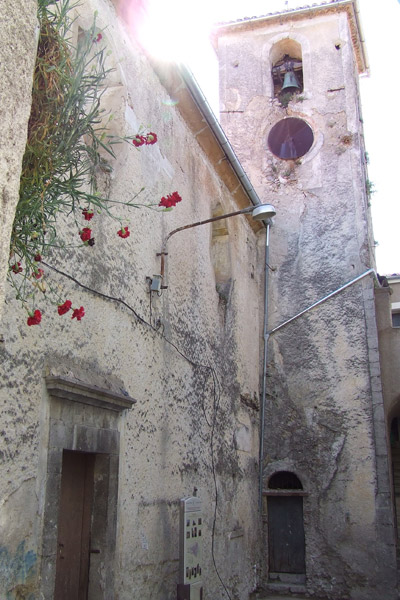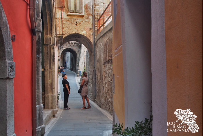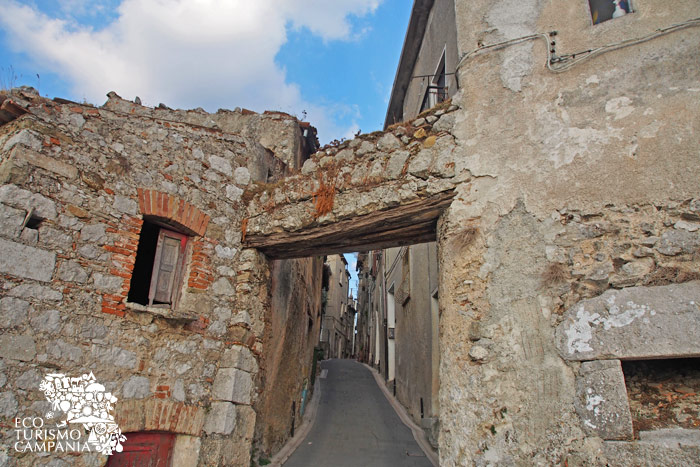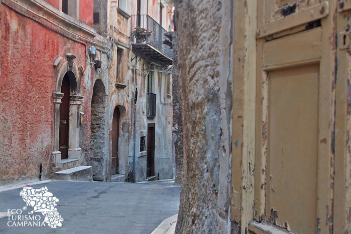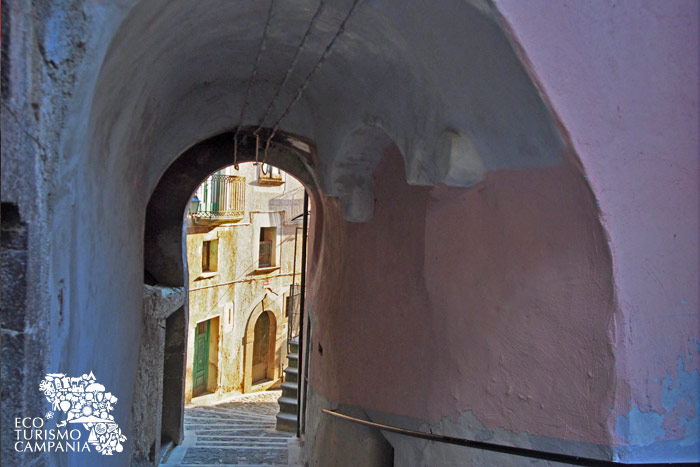Ci addentriamo nel borgo incamminandoci nel dedalo di vicoletti che attraversano il centro storico, dove quasi tutte la case mostrano affascinanti portali in pietra, spesso impreziositi da fregi e stemmi di antica memoria. Passiamo attraverso strettoie, archi e volte, ammirando scorci suggestivi e vecchie abitazioni. Sebbene quasi tutte risalenti al periodo medievale, alcune di esse si presentano con colori caldi e fiori alle finestre, altre, invece, con la facciata in pietra e in molti casi sono disabitate. Ciò nonostante emanano un fascino particolare, un misto di autenticità e languida decadenza. Su quasi ogni porta si notano i caratteristici battenti in ferro, praticamente gli antenati dei campanelli, che la gente del luogo chiama “truzzulatur”.