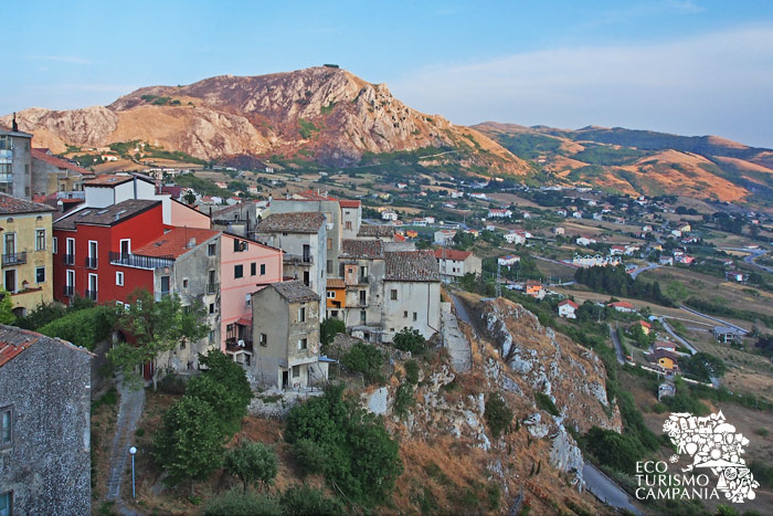 Prima di giungere al paese, dalla strada scorgiamo il borgo che si erge imponente sulla cima di un costone roccioso ad oltre 800 metri di altitudine. Lungo il percorso si possono ammirare dolci colline, uliveti, campi di grano, valli e cime rocciose che disegnano un suggestivo paesaggio rurale. Si ha l’impressione di sconfinare in altre dimensioni temporali.