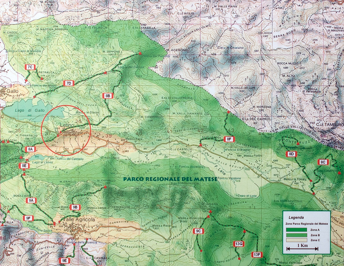 Dal Valico di Sprecavitelli (al confine con San Gregorio Matese) segui il segnavia 8C fino alla cima. Qui si gode di una grandiosa visione sulla Rava Matese (in Letino) e sulla Rava del Miletto (in San Gregorio). La serra divide il Campo dell’Acero in due parti, più vasta quella che ricade in San Gregorio, meno quella che ricade in Letino. Dal Campo dell’Acero puoi raggiungere la vetta del monte Miletto.
